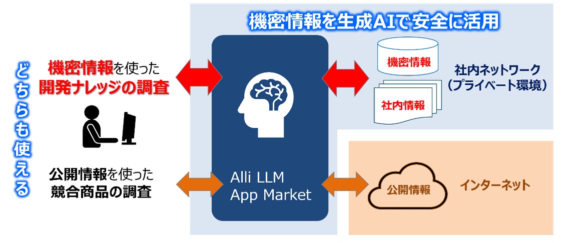 今回、日立ソリューションズは、Alli LLM App Marketのプライベート環境での利用を可能にし、両社で企業活動で生成されるさまざまな機密情報の生成AI・LLMによる安全な活用をサポートします。