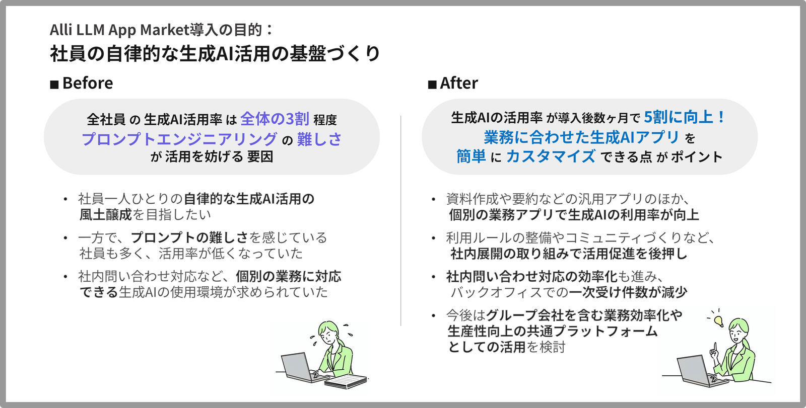 そのためには、個別の業務に対応できる生成AIアプリが重要になると考え、社員一人ひとりが自律的に生成AIの活用領域を拡大できる状態を目指して、2024年度からAlli LLM App Marketの活用に取り組んでいます。