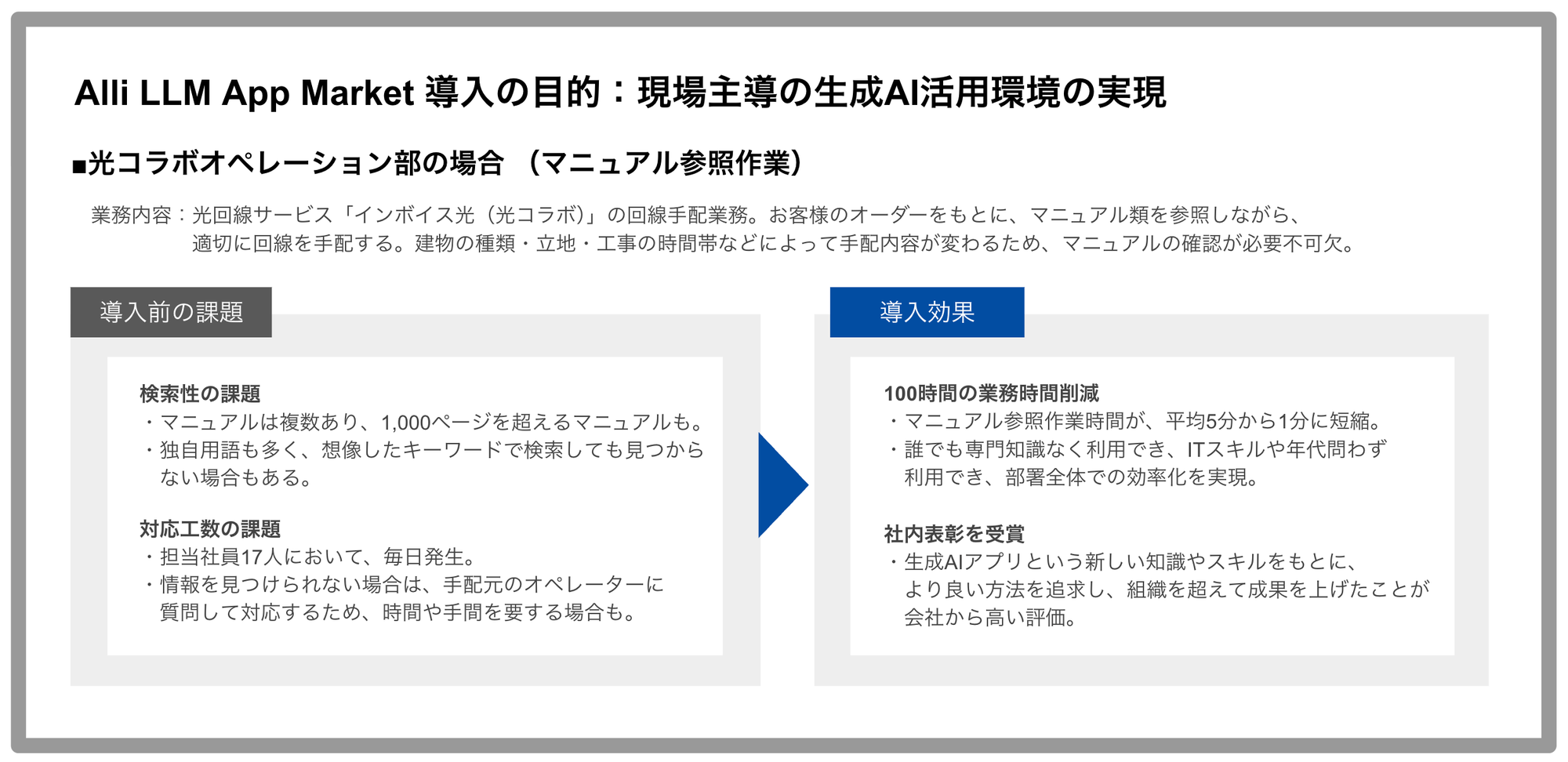 上田様:Alli LLM App Marketならば、費用対効果も見込めます。光コラボオペレーション部では、対象業務における所要時間をもとに導入効果を可視化しています。回線手配のマニュアル検索では、これまでのやり方では5分、生成AIを使った場合は1分以内に短縮されるため、月100時間の削減効果が見込めました。