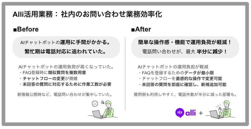 Alli導入後、お知らせを掲示する前にAlliにFAQを登録し、掲示文書の問い合わせ先欄に「AIチャットボットでも質問を受け付けています」と記載したところ、電話問い合わせの件数が以前の半分以下になり、Alliの効果を実感したという声が上がっています。