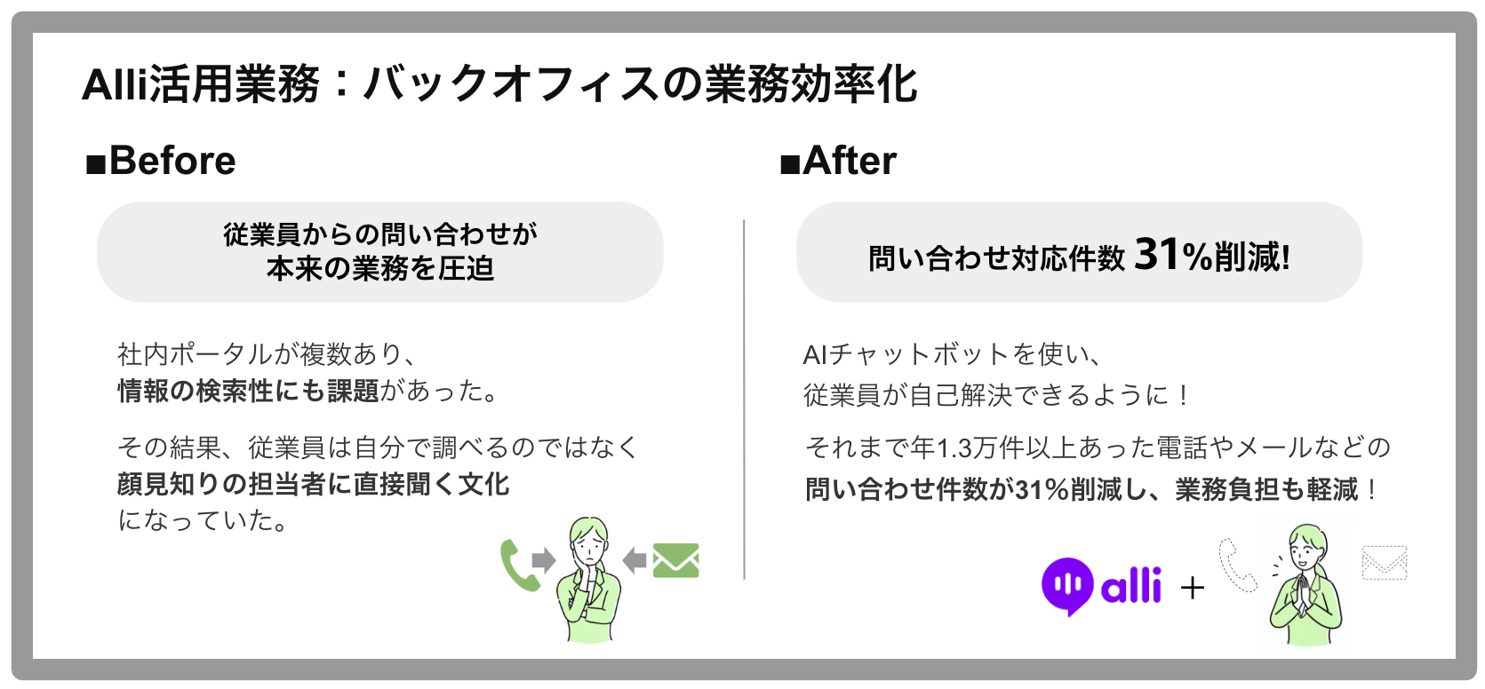 導入当初はAlliのアイコンを出す場所とポータルのデザインの調整に苦戦することもありましたが、Alliを導入したことで、課題であった社内からの問い合わせ対応業務に変化を感じています。