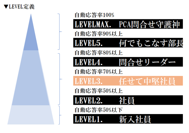 毎月の問い合わせ件数や自動応答率を社内全体に共有した上で、自動応答率に応じてその月のきゃりーちゃんの社員レベルをお伝えしています。