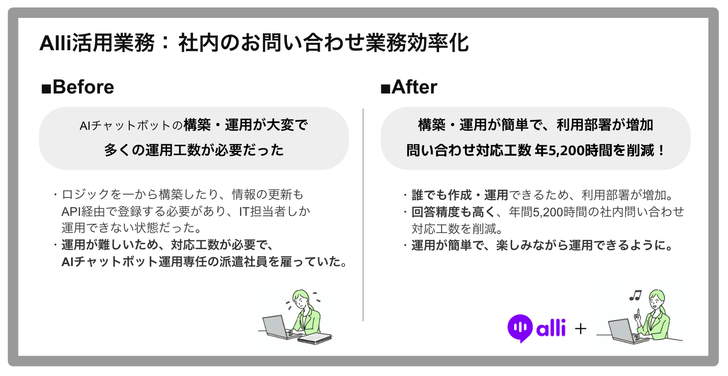 Alliに変更後、年間約5,200時間、1,300万円分のお問い合わせ工数を削減!