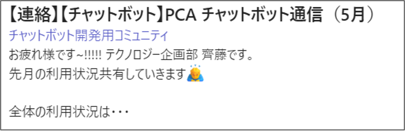 「自動応答件数がこのぐらいです。」「自動応答率が○○%です。」「前月より増えました。」「各領域は○○%です。」など、全担当者が入っているTeamsのグループで、運用担当者向けのレポートを発信しています。