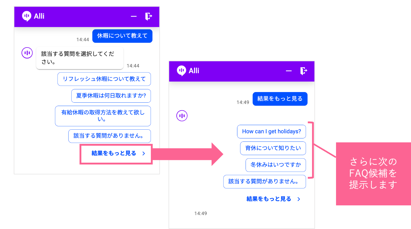 ユーザーの質問に対して、あらかじめ指定した数の回答候補を提示した上で、「結果をもっと見る」ボタンを表示させることができます。ユーザーは「結果をもっと見る」ボタンをクリックすることで、さらに多くの回答候補を確認でき、求める回答に辿り着きやすくなります。(※詳細は下図を参照)