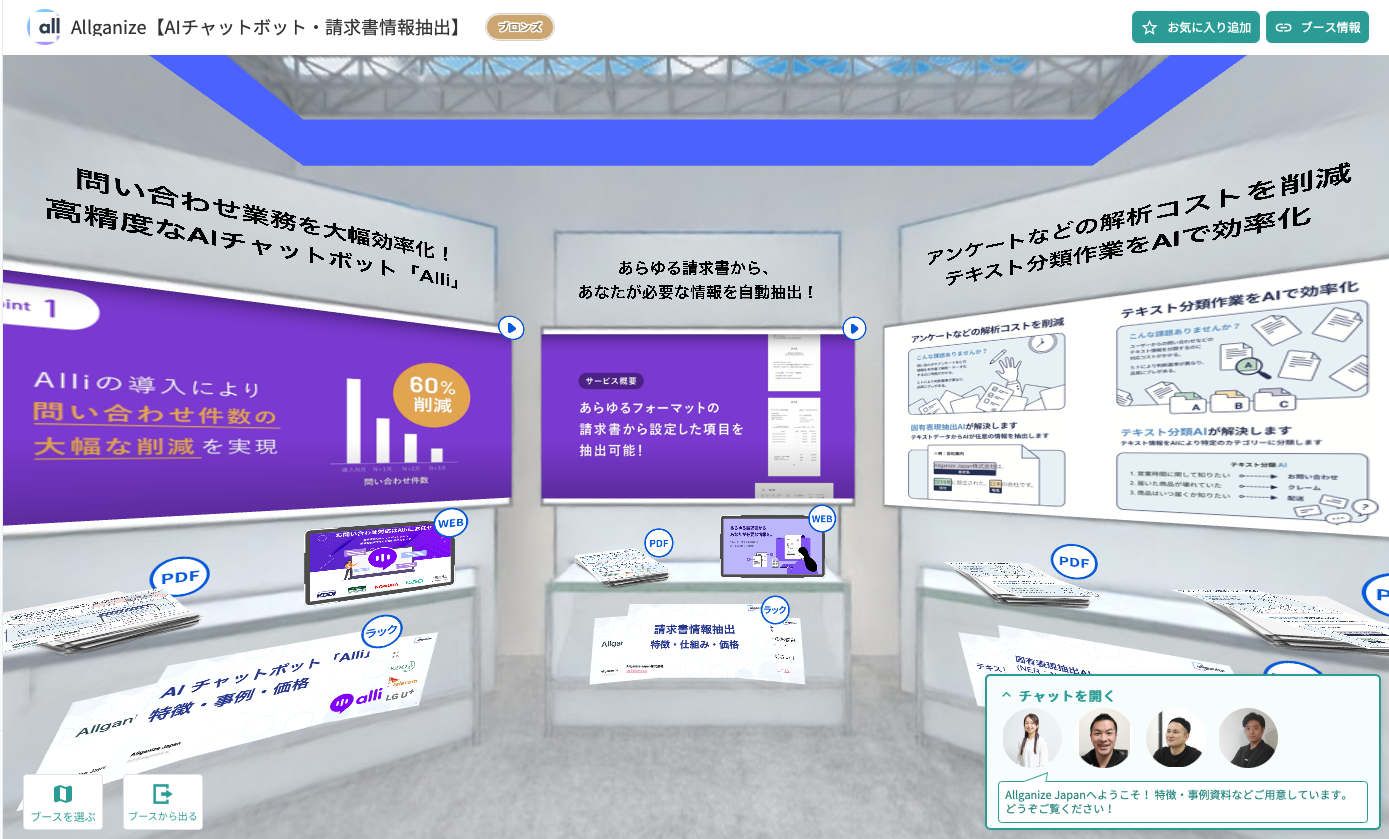 ブースでは、AIチャットボット「Alli(アリィ)」、請求書情報抽出など、以下の4つのサービスをご紹介しました。