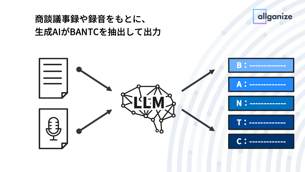 生成AIを活用すれば、商談メモや議事録、録音データをLLMに渡すだけでBANTCの各項目を自動で抽出してくれます。