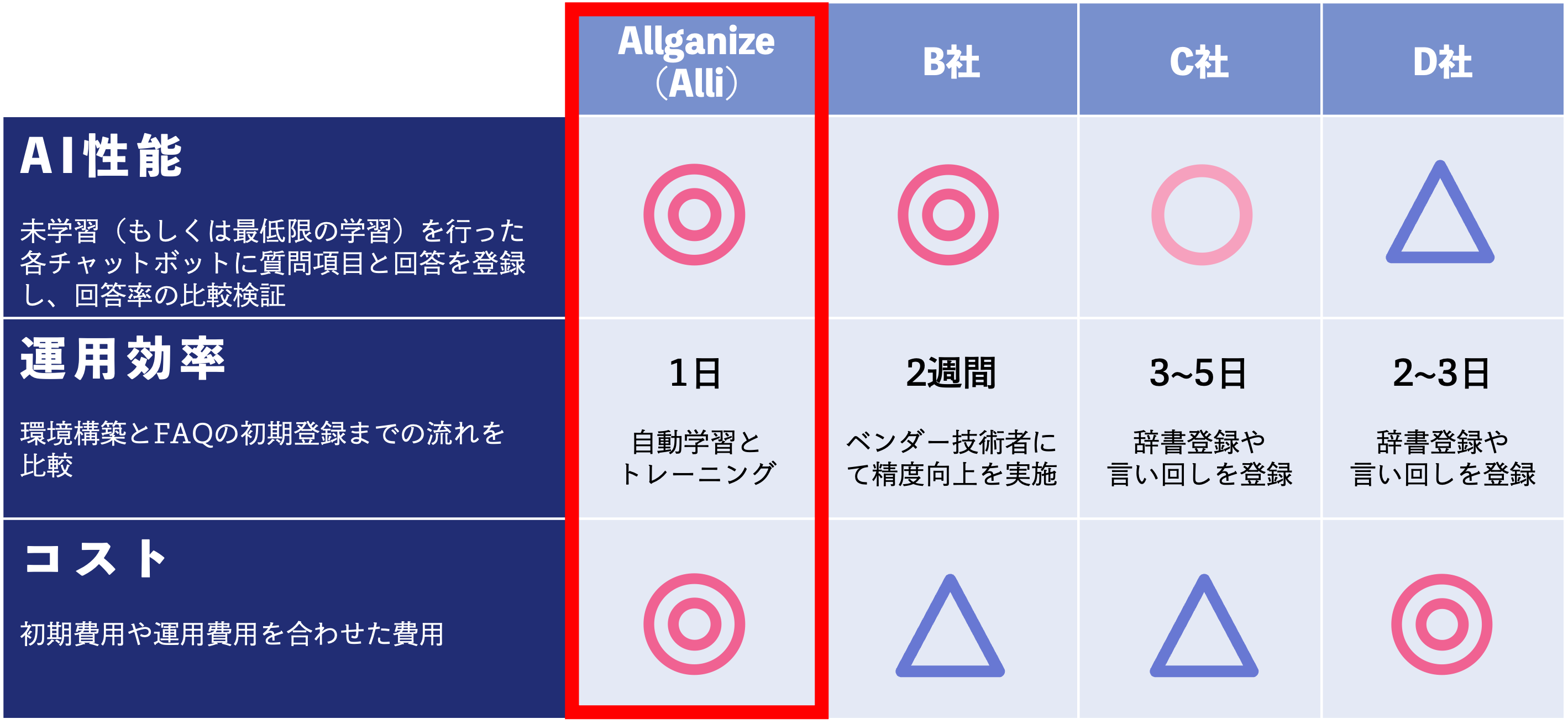 費用面に関しては、従量課金制になっているD社が1番安く、次に初期費用:25万円、月額費用:10万円から使用可能なAllganize、次に導入に数百万とかかるB社、C社の結果となりました。