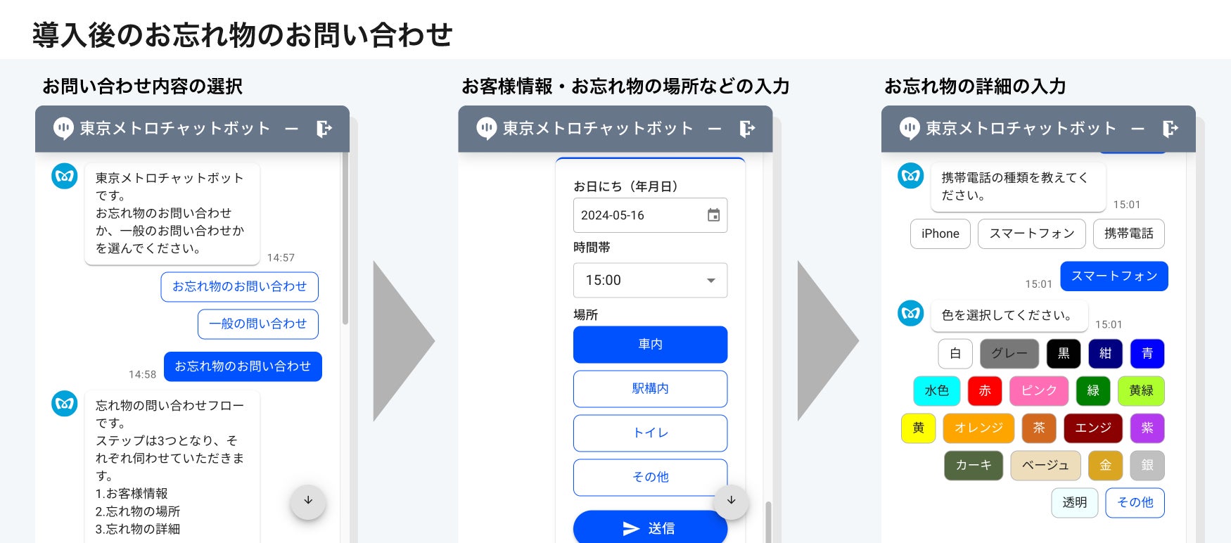 従来のお忘れ物に関するメールでのお問合せにおいて、お忘れ物の検索に必要な情報を充足させるため、複数回にわたる確認が必要となる場合もありました。今後は、チャットボットにて、お忘れ物の特徴に合わせて必要な情報を会話形式にてご入力いただけるようになり、お客様のお手間を少なくいたします。