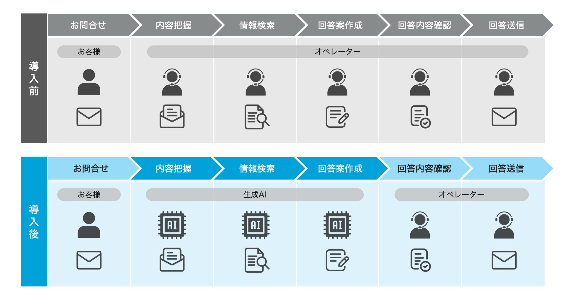 お客様からメールでいただいたお問合せに対して、生成AIで内容の把握、回答に必要な情報の検索及び回答案の作成を行います。従来オペレーターが人力で行っていた一連の業務を自動化することで業務効率を向上し、より多くのお問合せに迅速に対応してまいります。