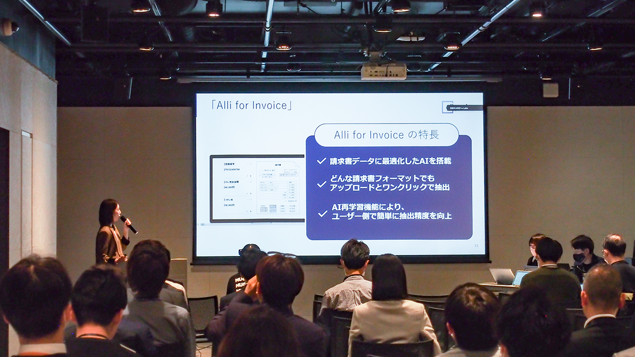 ソリューション紹介では、あらゆる請求書から必要な情報を自動で抽出する「Alli for Invoice」と、AIチャットボット「Alli」の新サービスである「回答自動生成型検索サービス(ChatGPT連携)」について、デモも交えながらご紹介しました。