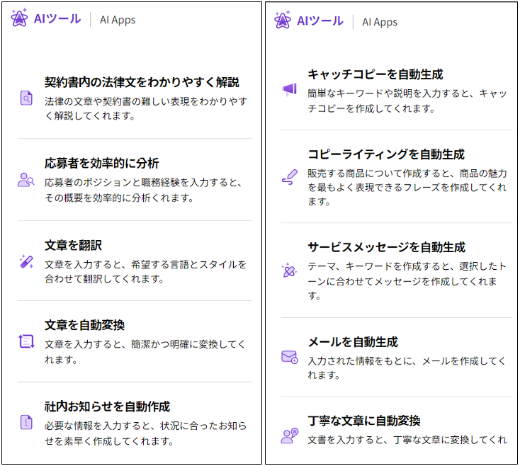 「Polaris AI Office クラウド」の AI Apps では、より簡単にAIを使いこなすための各種アプリが用意されています。
