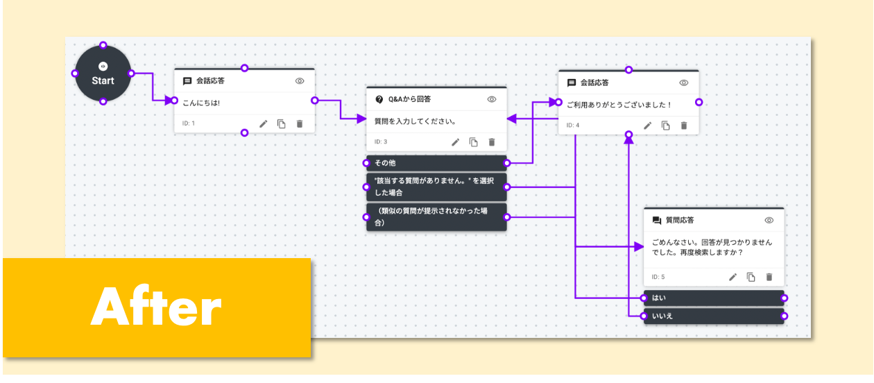 従来よりもノードを繋ぐ矢印が整理され、チャットフローの全体像を確認しやすくなります。